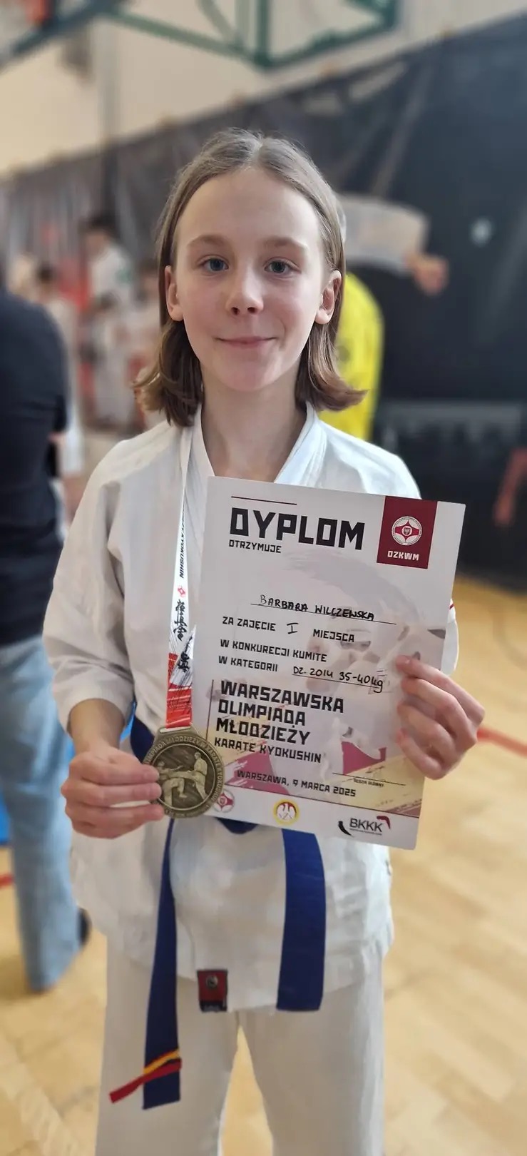 Barbara Wilczewska - uczennica klasy 4d od sześciu lat trenuje karate kyokushin w Klubie IPPON w Konstancin Jeziornej. W tym roku zaczęła swoją przygodę w turniejach pozaklubowych, wygrywając złoty medal na Warszawskiej Olimpiadzie Młodzieży w walkach kumite w kategorii dziewcząt z rocznika 2014 w kategorii wagowej 35-40 kg.