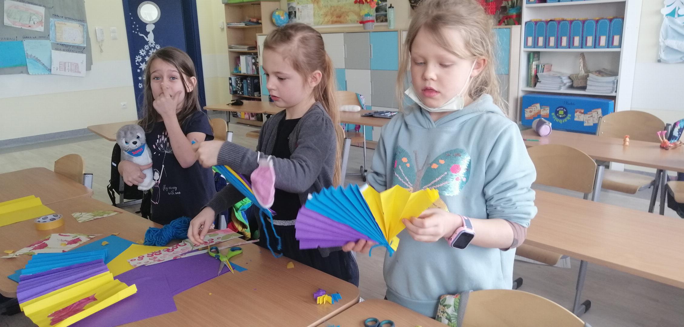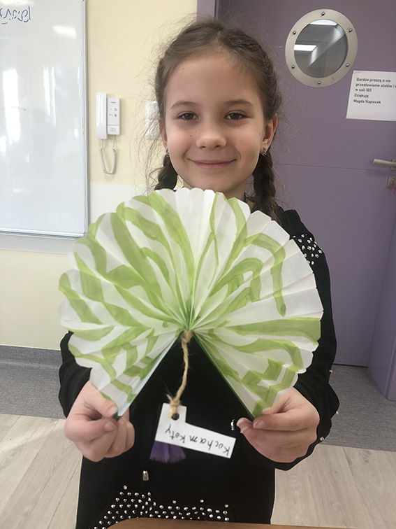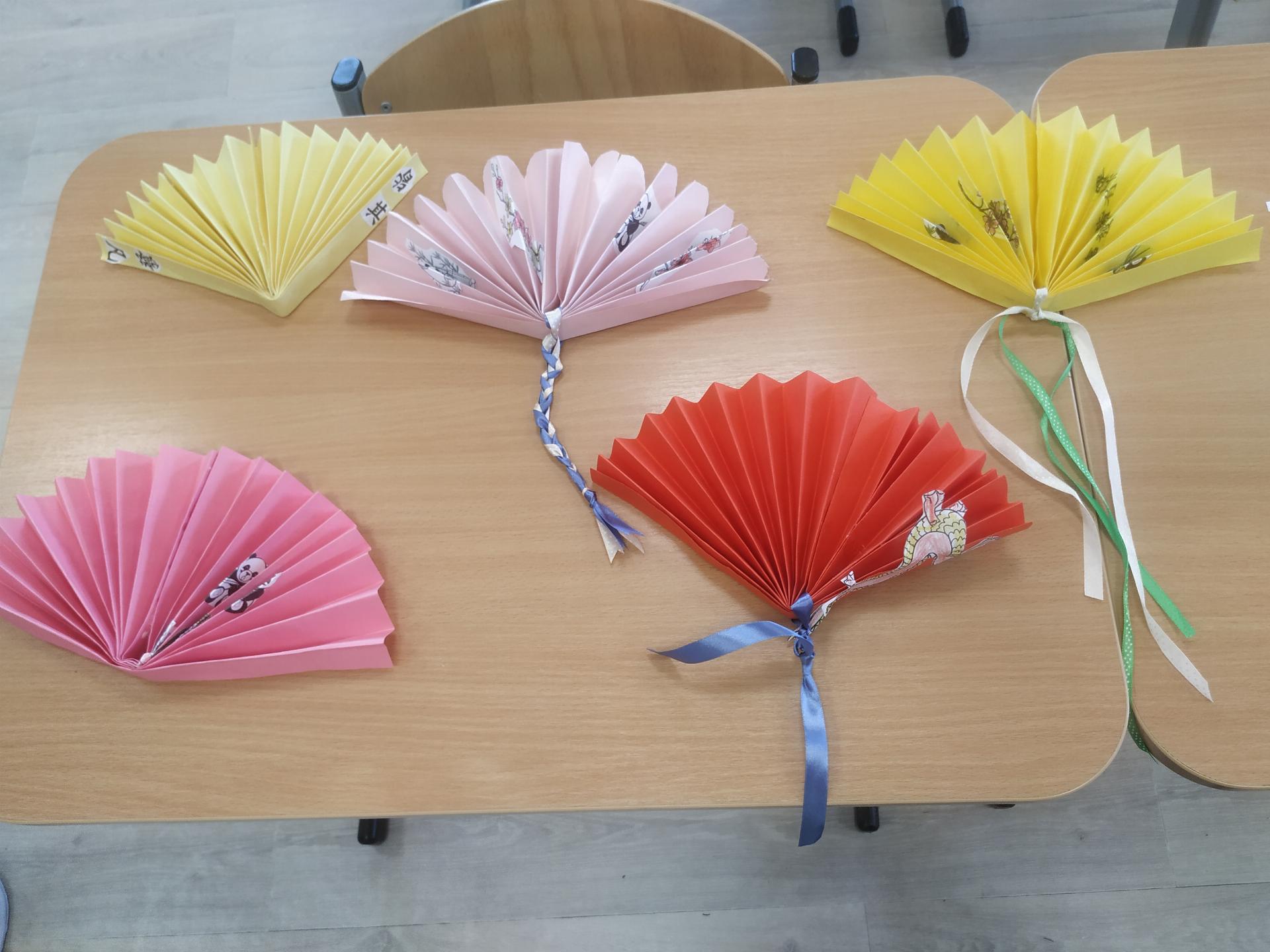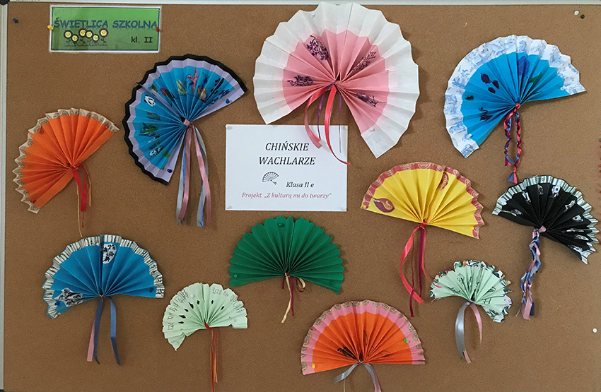 W ramach projektu "Z kulturą mi do twarzy" Moduł IV Kultury Świata nasi uczniowie z klas 2 zainspirowani kulturą Chin wykonali z papierów o różnej strukturze piękne, papierowe wachlarze. Poznali krok po kroku wszystkie etapy tworzenia wachlarza - składania papieru, wycinania i rysowania chińskich ornamentów kwiatowych, symboli i znaków zodiaku oraz dodawania ozdobnych paseczków i tasiemek. Uczniowie klas pierwszych z zainteresowaniem obejrzeli film pt.: “Odkrywanie Chin - Przepiękny taniec z wachlarzami i wstęgami. - link....”. Zainspirowani nagraniem chętnie przystąpili do pracy. Z kolorowych kart technicznych, włóczki i pasków ozdobnych tapet wykonaliśmy barwne wachlarze. Dziurkaczami ozdobnymi zrobiliśmy dodatkowe ozdoby.