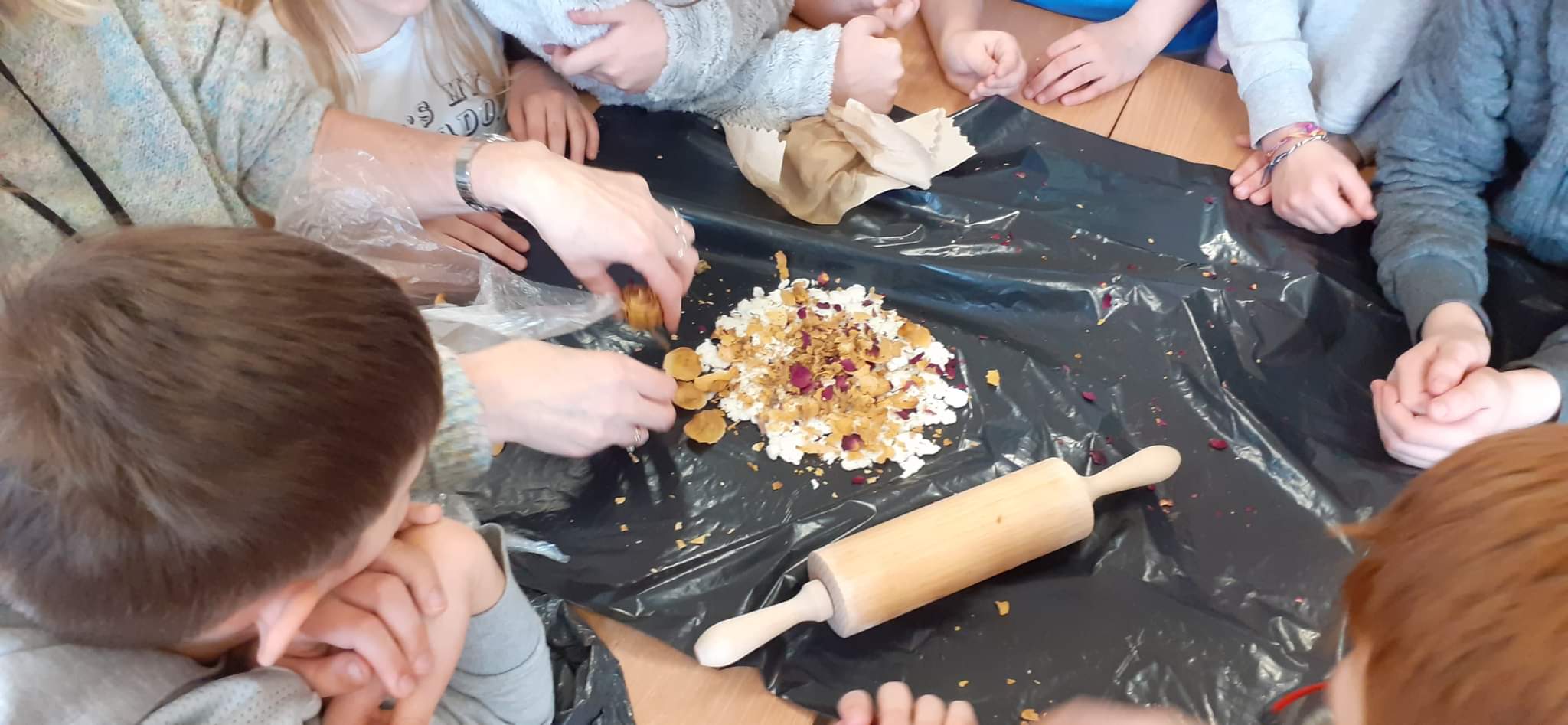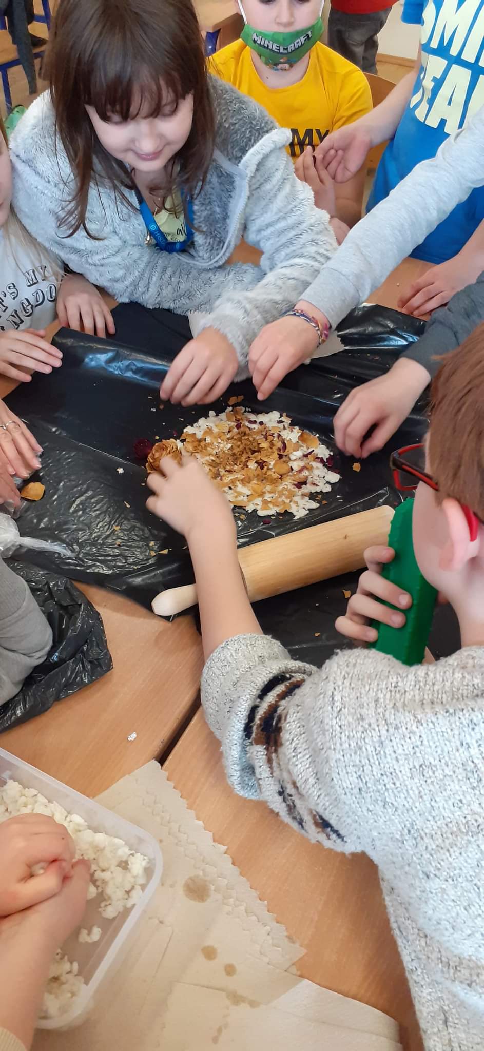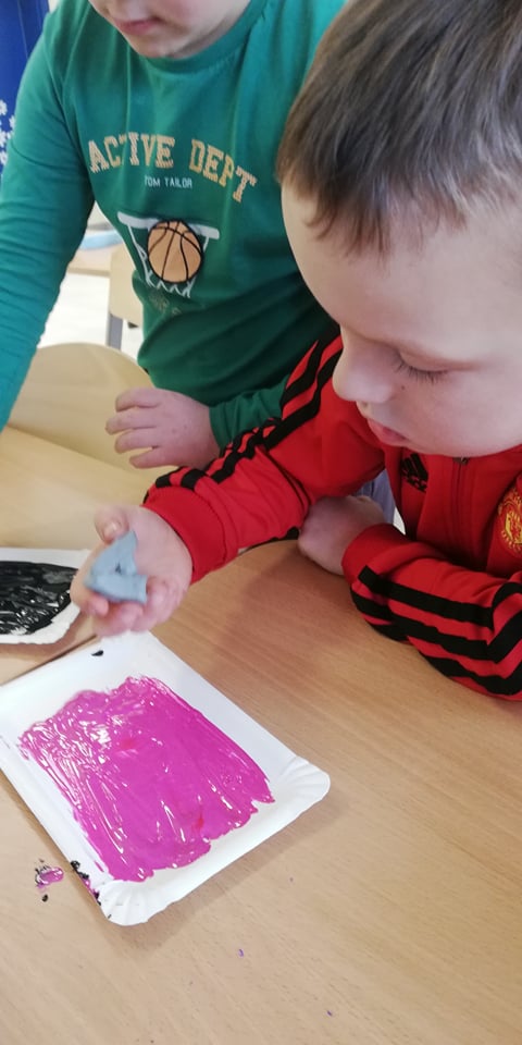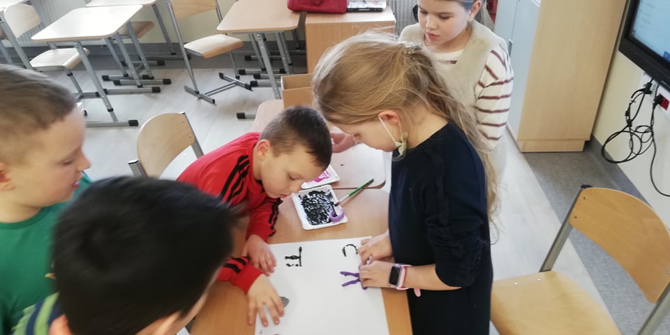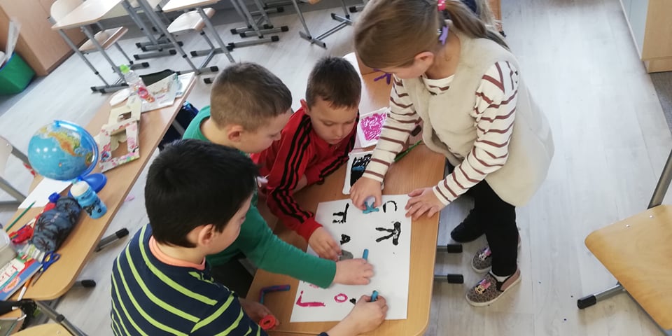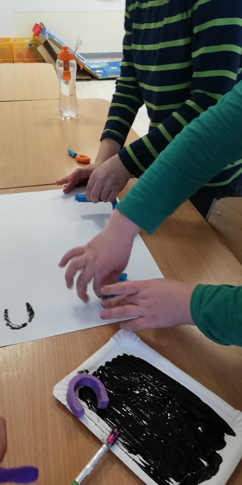 Zadaniem uczniów klas drugich było zaprojektowanie wynalazku i wykonanie z materiałów plastycznych lub z klocków konstrukcji swojego wynalazku. Dzieci mogły wymyślać i tworzyć, wykazując tym samym pomysłowość i kreatywność. Zabawa ta przyniosła im ogromną satysfakcję. W klasach pierwszych skupiliśmy się na druku. Z plasteliny dzieci wykonały literowe “czcionki”, które po zanurzeniu w farbie odbijaliśmy na kartach.