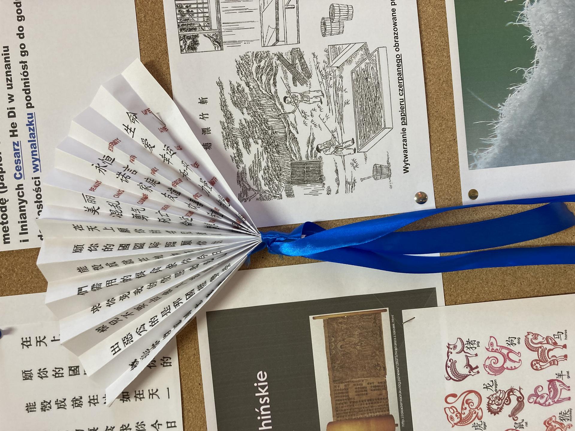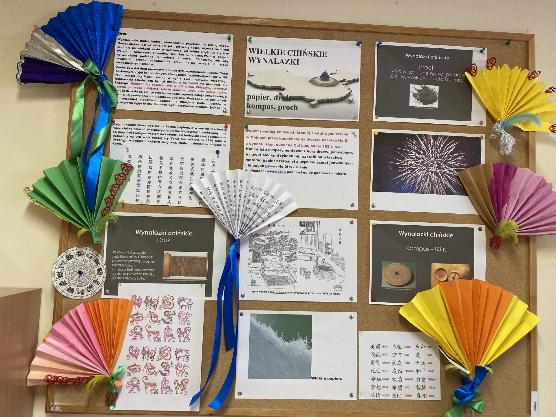 Dzieci z klas czwartych obejrzały film pt.: “Wynalazki chińskie, które zmieniły świat”. Uświadomiły sobie jak wiele rzeczy codziennego użytku, m.in.: papier, kompas, druk, wynaleziono właśnie w Chinach. Następnie skoncentrowały się na pracach plastycznych. Powstały fantastyczne wachlarze, które ozdobiły gazetkę ścienną.