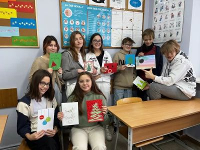 Pierwszym etapem projektu było wykonanie kartek świątecznych, w których znalazły się życzenia w języku hiszpańskim. Udało nam się zebrać blisko 100 przepięknych prac, które następnie zostały wysłane do naszych partnerów w szkołach podstawowych w Espoon niedaleko Helsinek oraz w Villeneuve-d’Ascq na północy Francji.