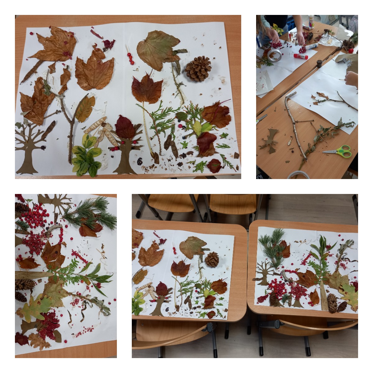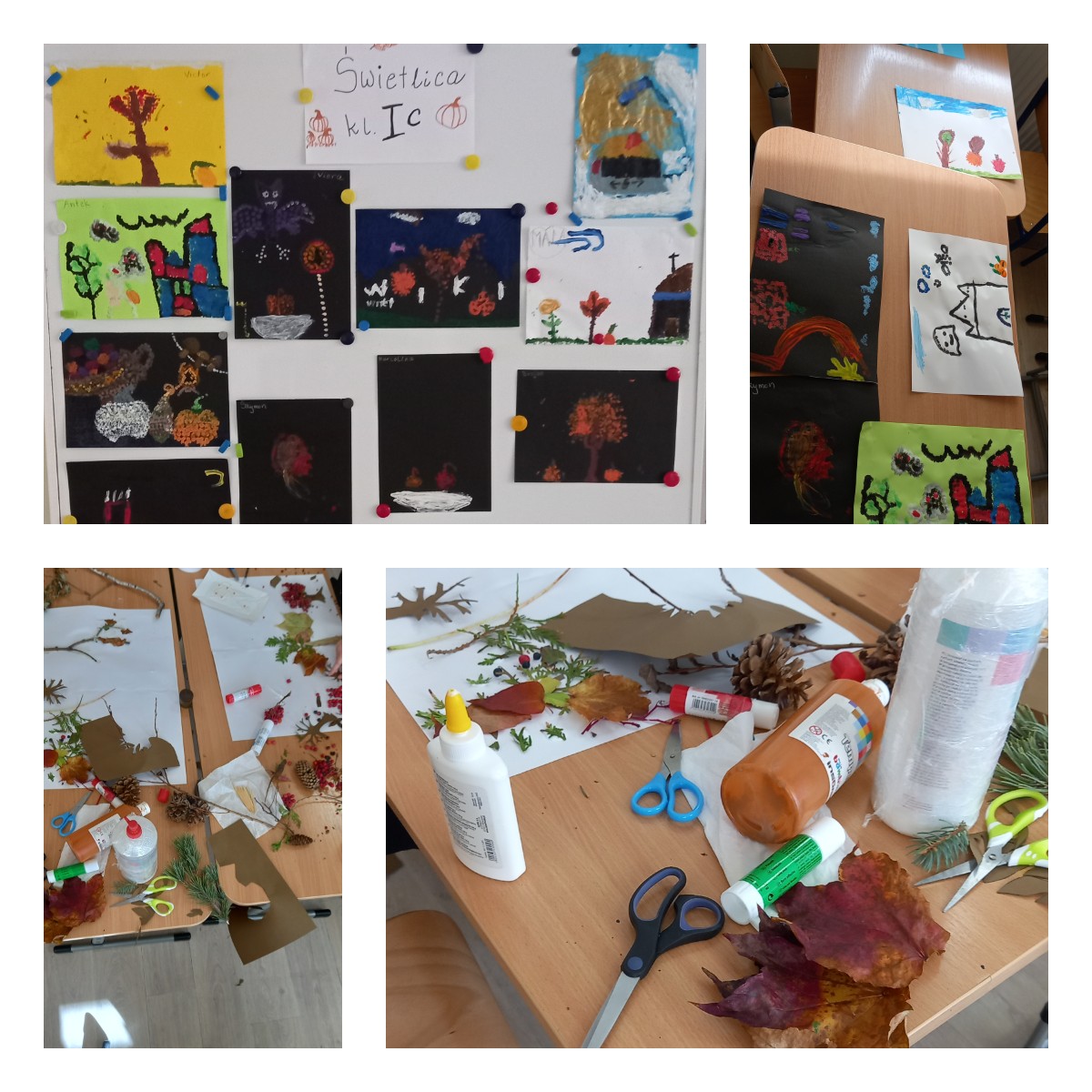 We wrześniu dzieci przygotowały własnoręczne karmniki dla ptaków i rozmawiały o tym, jak możemy pomagać skrzydlatym przyjaciołom przed nadchodzącą zimą. W październiku uczniowie stworzyli jesienne obrazy z dyniami, wykorzystując patyczki kosmetyczne do stemplowania, a przy okazji poznali barwy jesieni i rozmawiali o czasie zbiorów. Listopadowe zajęcia przybliżyły dzieciom różnice między drzewami iglastymi a liściastymi; po wspólnym spacerze i zebraniu naturalnych materiałów dzieci wykonały przestrzenny las 3D z wykorzystaniem darów przyrody. Grudzień upłynął pod znakiem kolorowych choinek, które dzieci tworzyły za pomocą stemplowania zgniecioną kulką papieru, a następnie ozdabiały je własnoręcznie wykonanymi dekoracjami.
