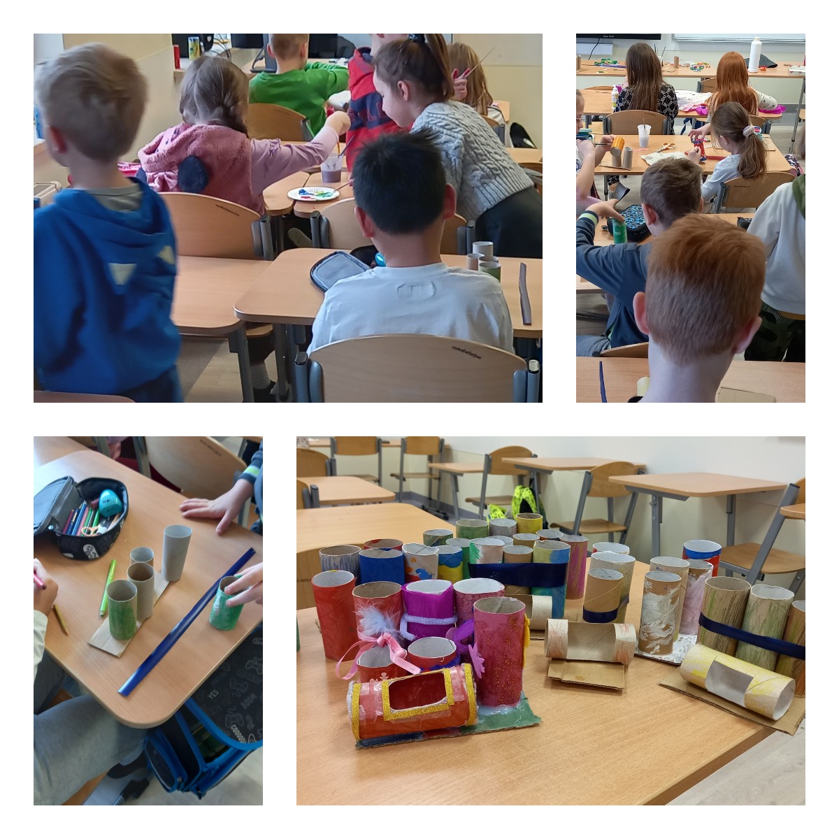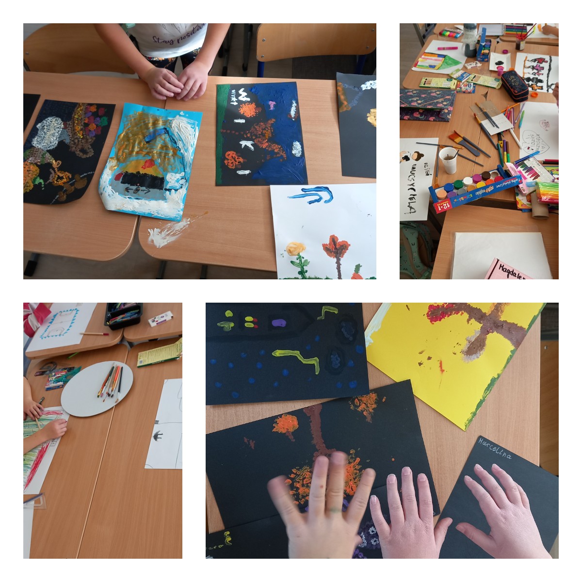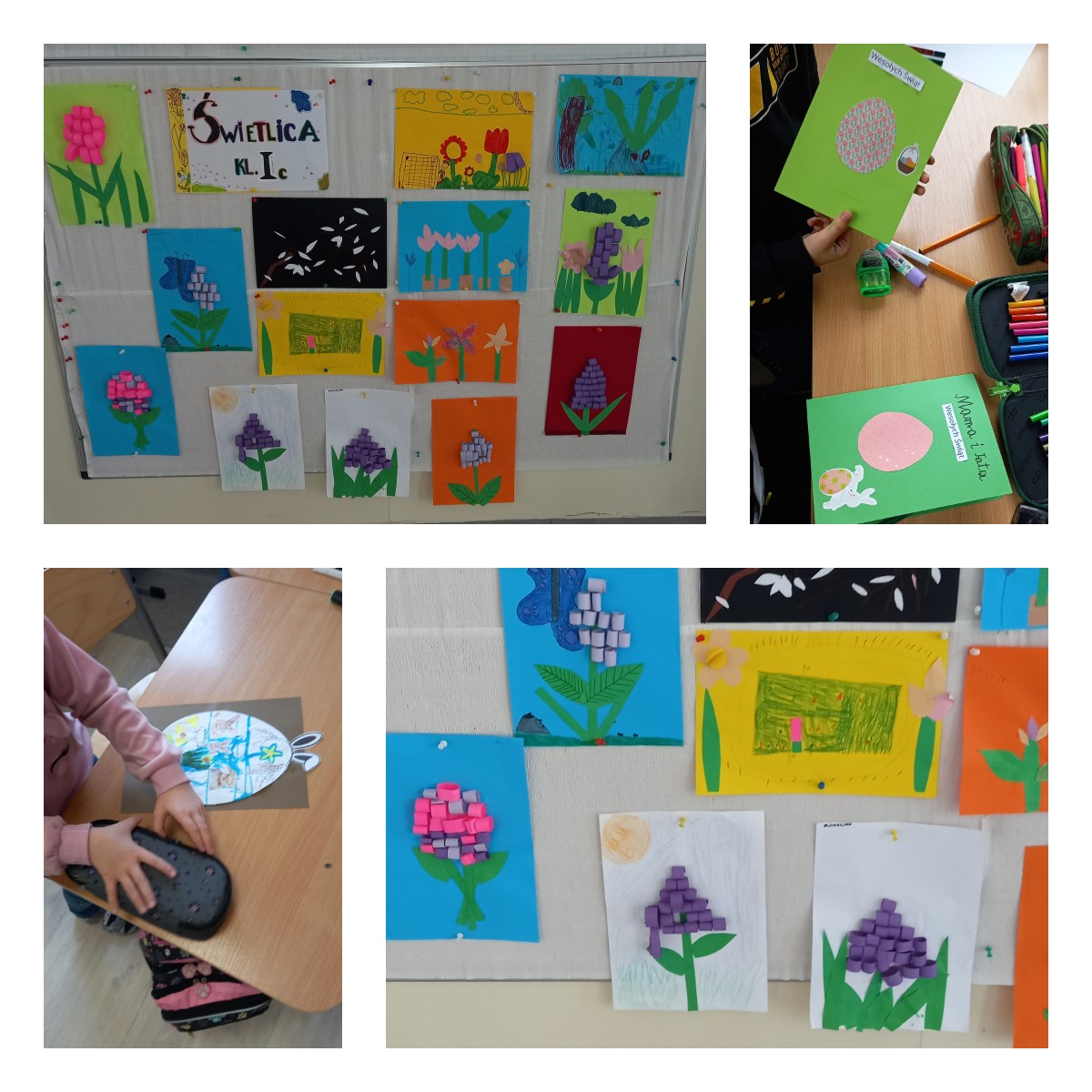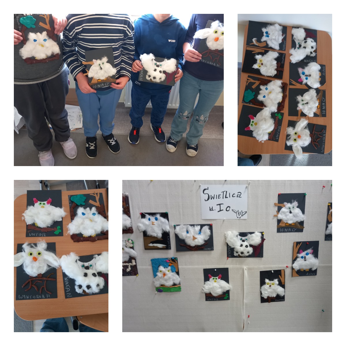 W styczniu uczniowie poznali ciekawostki na temat sowy śnieżnej, jej wyglądu i środowiska życia, a następnie wykonali puchate prace plastyczne z waty i plasteliny. W lutym z okazji Światowego Dnia Czystego Biurka dzieci rozmawiały o porządku i organizacji przestrzeni do nauki, a następnie stworzyły własnoręcznie ekologiczne organizery z rolek po papierze toaletowym. W marcu uczniowie poznali wiosenne kwiaty i ich cechy, a następnie wykonali piękne papierowe kompozycje przedstawiające hiacynty. Kwiecień był okazją do rozmów o tradycjach wielkanocnych – dzieci samodzielnie napisali życzenia, zaprojektowały i wykonały kolorowe kartki świąteczne, które następnie wręczyły swoim bliskim. W czerwcu dzieci wykonały bajkowe motyle z bibuły i wody, poznając właściwości barw oraz zasady bezpieczeństwa pracy z wodą i nożyczkami.