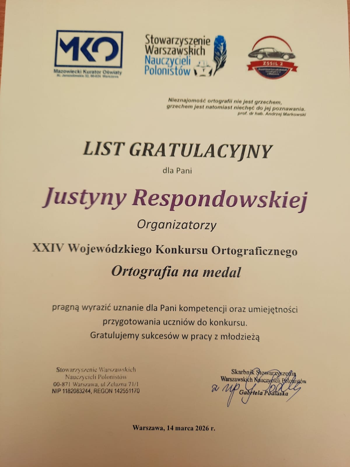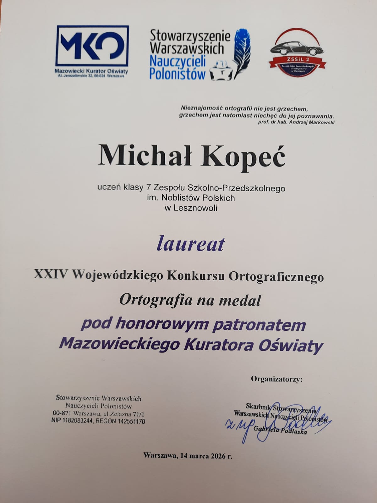 Z dumą informujemy, że Michał Kopeć, uczeń klasy 7a, został laureatem XXIV Wojewódzkiego Konkursu Ortograficznego „Ortografia na medal”, objętego honorowym patronatem Mazowieckiego Kuratora Oświaty.