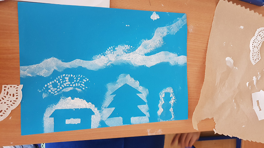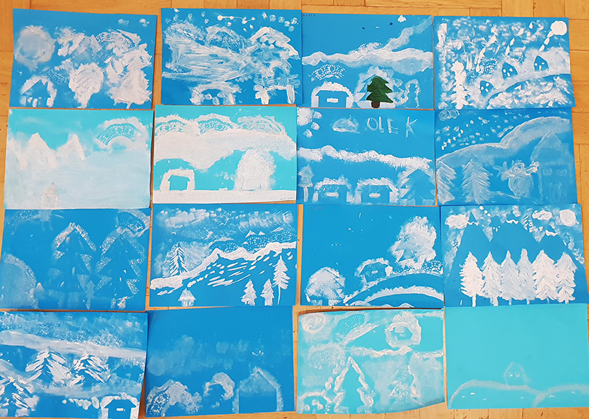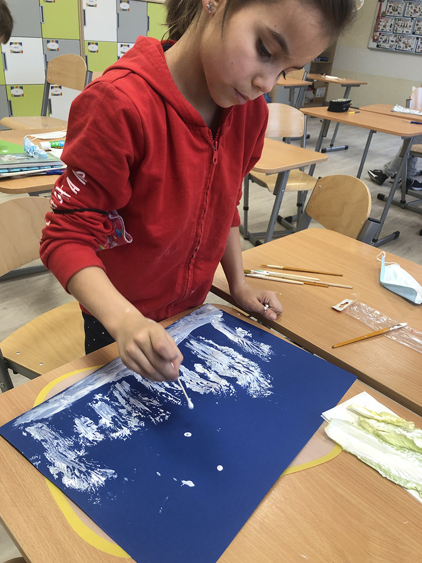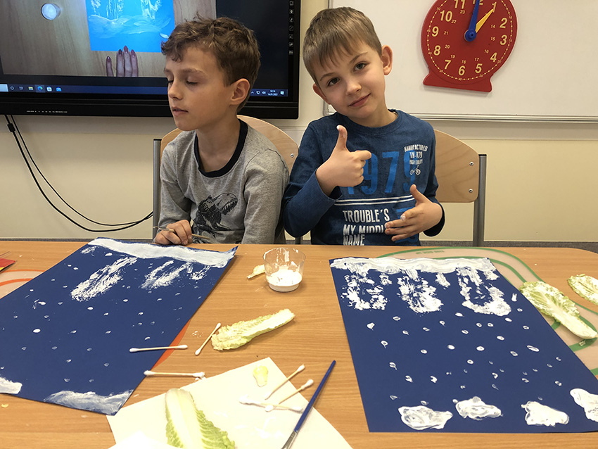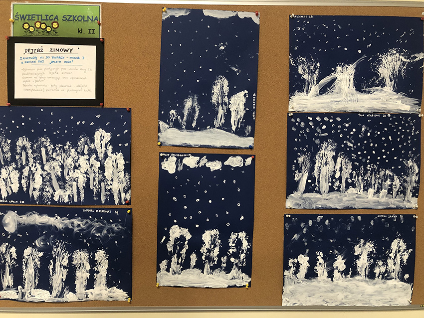 Z powodu warunków pogodowych, zajęcia plastyczne odbyły się w sali. Wykorzystaliśmy tablicę multimedialną w celu prezentacji przykładowych zimowych pejzaży, a następnie uczniowie wykonali w technice plakatowej prace z wyobraźni przedstawiające okolice szkoły. Dodatkowo posłużyliśmy się techniką odbijania, odciskania faktury na płaszczyźnie kartki. Dzieci myśląc o feriach zimowych i wypoczynku w górach, przy pomocy szablonów namalowały pełne uroku i klimatu zimowe krajobrazy. Efekty pracy uczniów podczas zajęć plastycznych zostały wyeksponowane na tablicach w świetlicy szkolnej. Bardzo nam się podobały.
