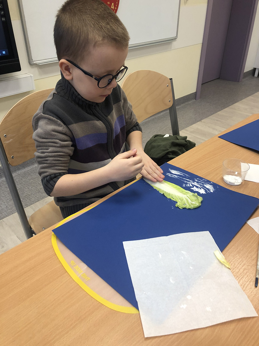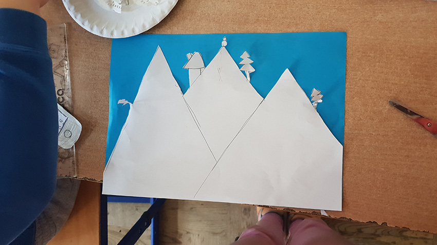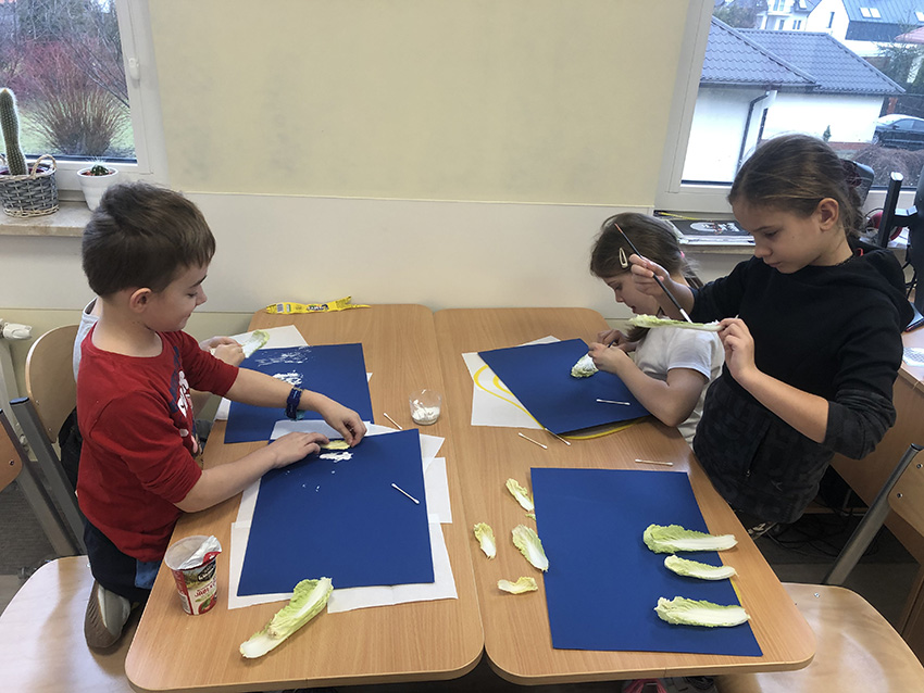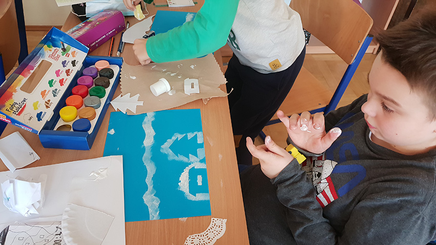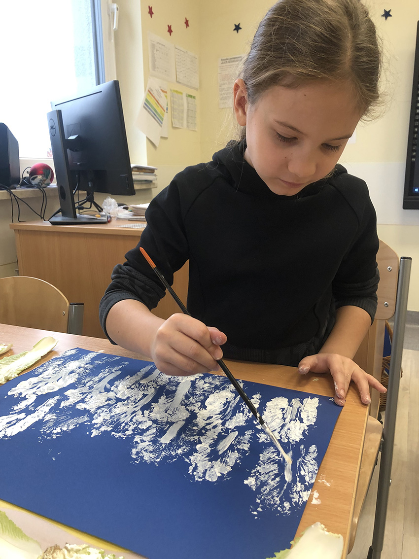 Z powodu warunków pogodowych, zajęcia plastyczne odbyły się w sali. Wykorzystaliśmy tablicę multimedialną w celu prezentacji przykładowych zimowych pejzaży, a następnie uczniowie wykonali w technice plakatowej prace z wyobraźni przedstawiające okolice szkoły. Dodatkowo posłużyliśmy się techniką odbijania, odciskania faktury na płaszczyźnie kartki. Dzieci myśląc o feriach zimowych i wypoczynku w górach, przy pomocy szablonów namalowały pełne uroku i klimatu zimowe krajobrazy. Efekty pracy uczniów podczas zajęć plastycznych zostały wyeksponowane na tablicach w świetlicy szkolnej. Bardzo nam się podobały.