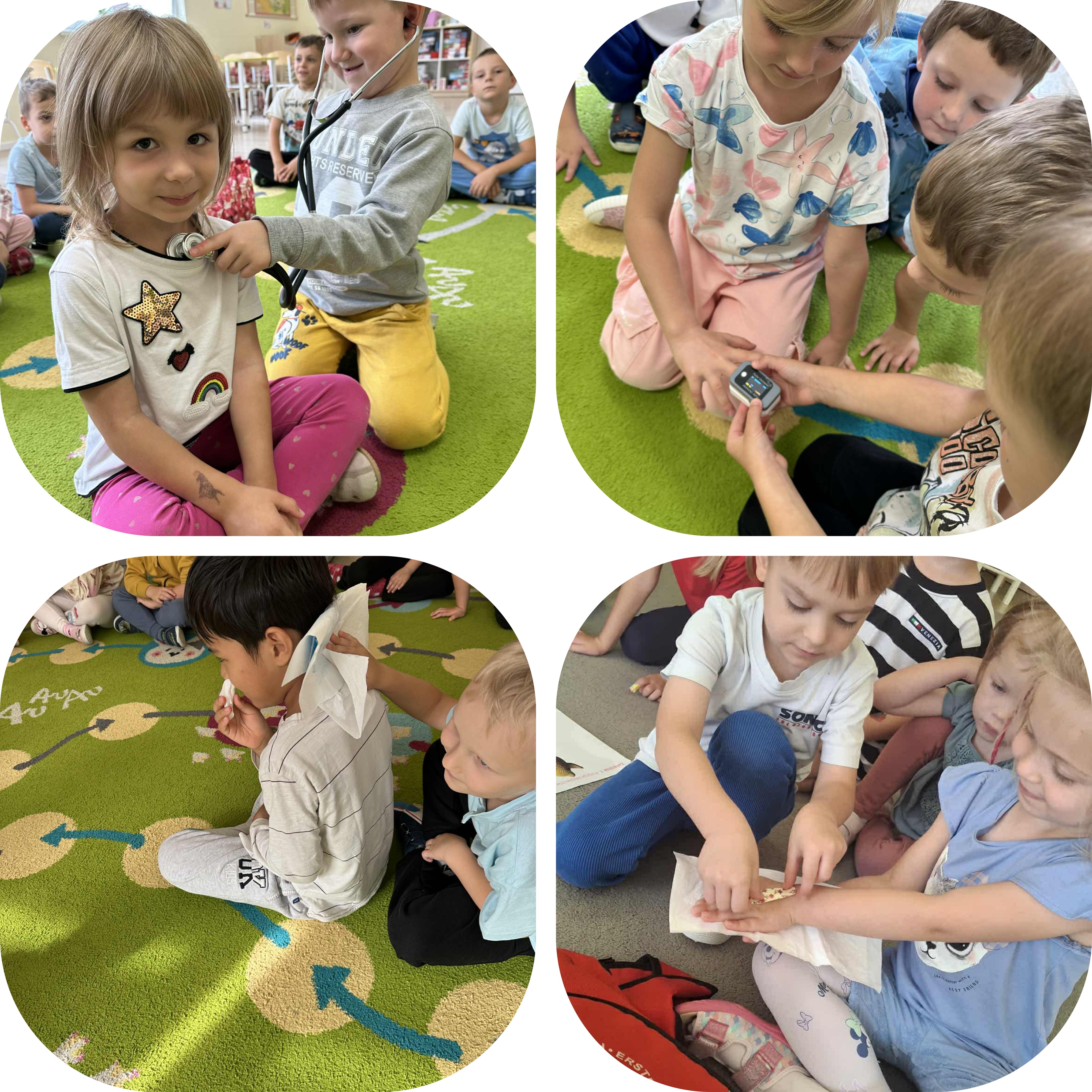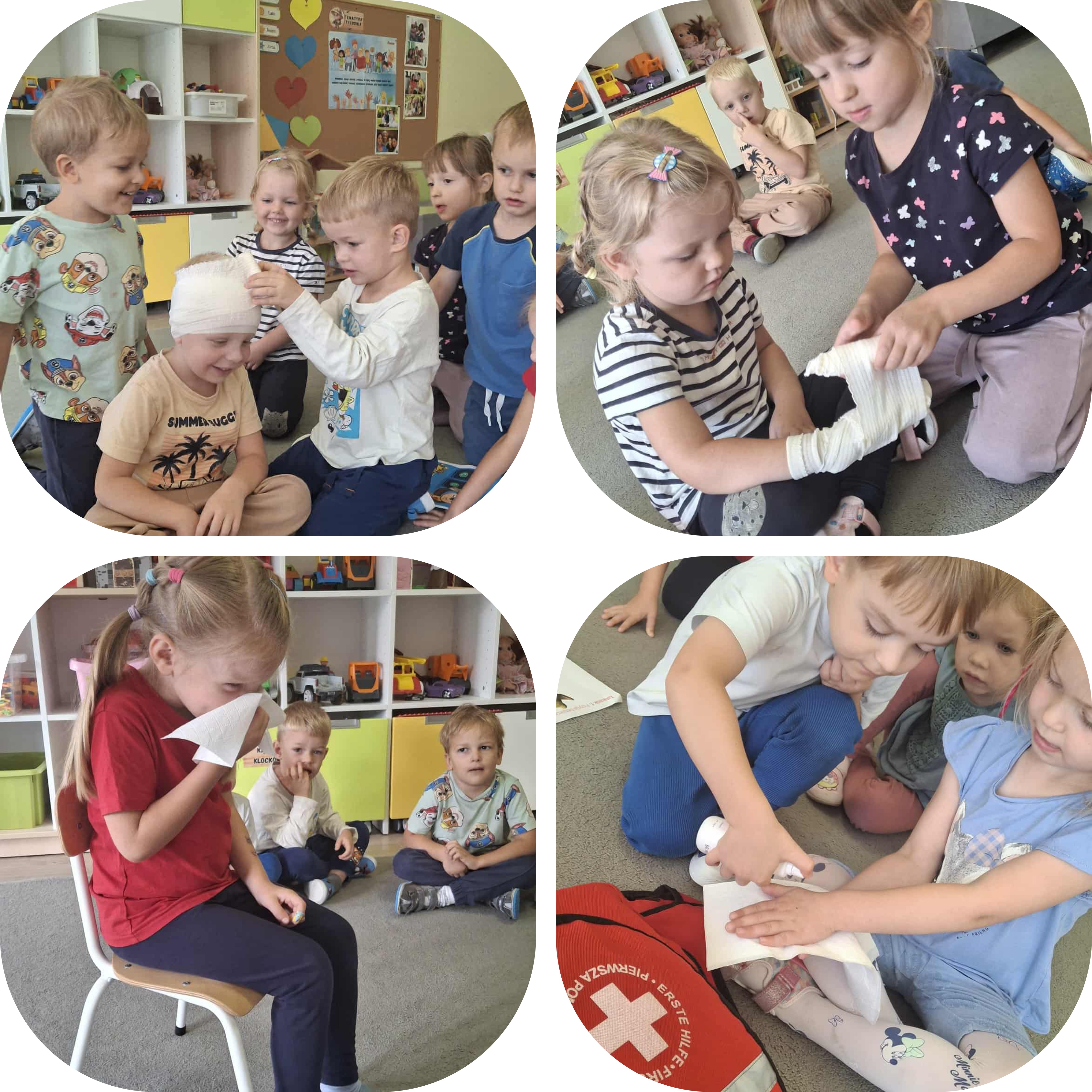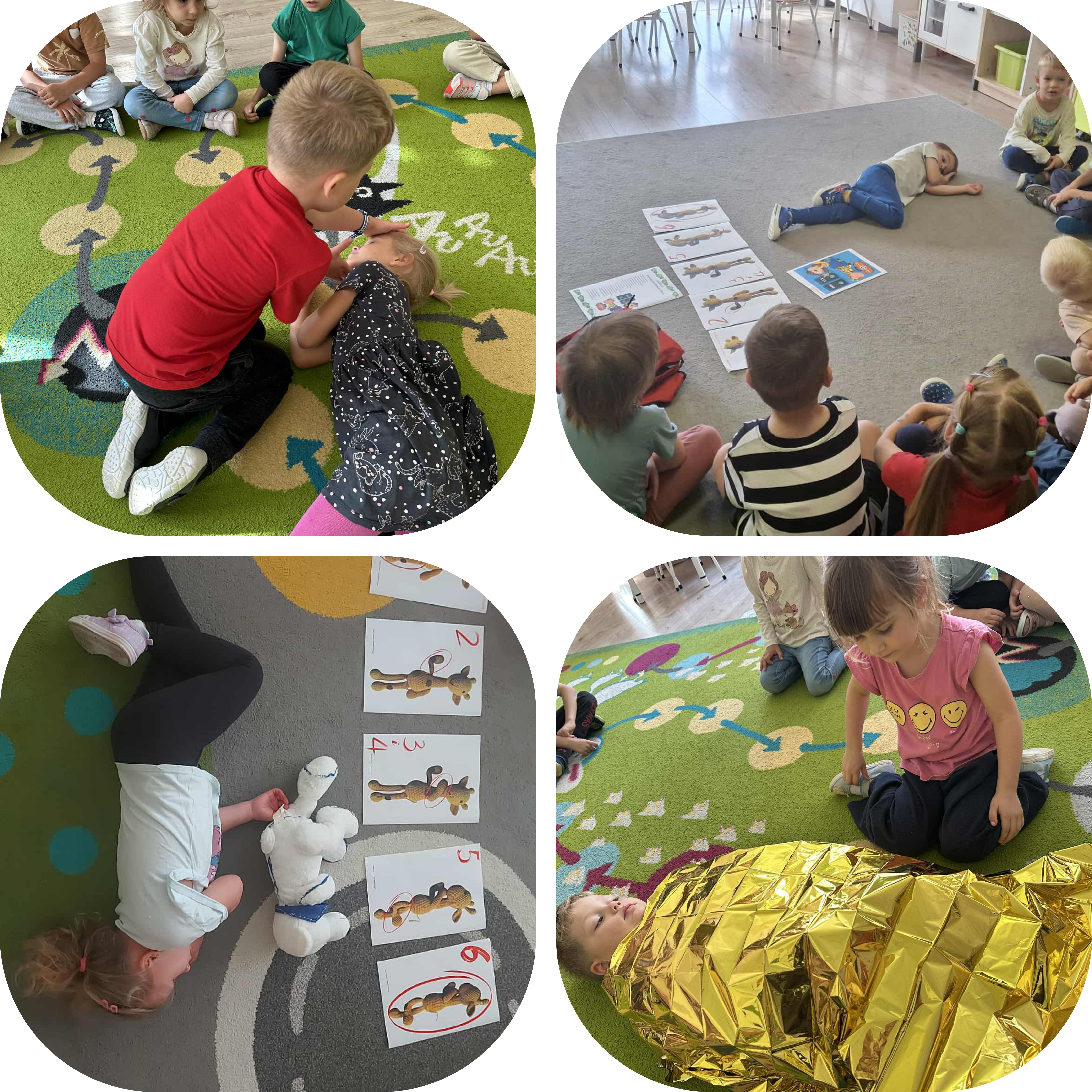 W dniu 15 września dzieci z naszego przedszkola brały udział w zajęciach z zakresu pierwszej pomocy. Dzieci miały okazję zapoznać się z podstawowymi zasadami udzielania pierwszej pomocy przedmedycznej, ćwiczyły m.in. ułożenie poszkodowanego w pozycji bezpiecznej, poznały numery alarmowe oraz dowiedziały się jak reagować w nagłych sytuacjach. Zajecia miały charakter praktyczny i dostawane były do wieku dzieci.