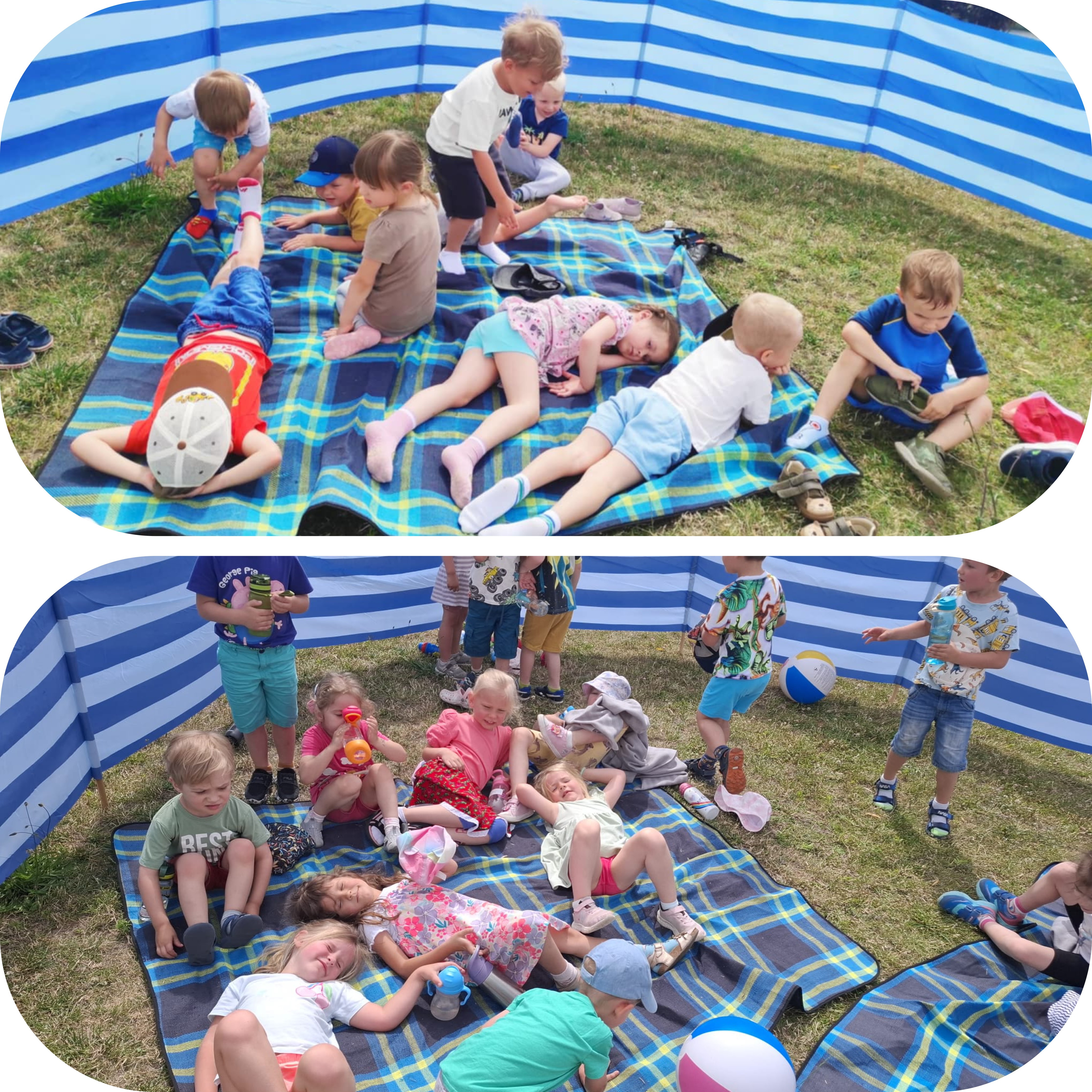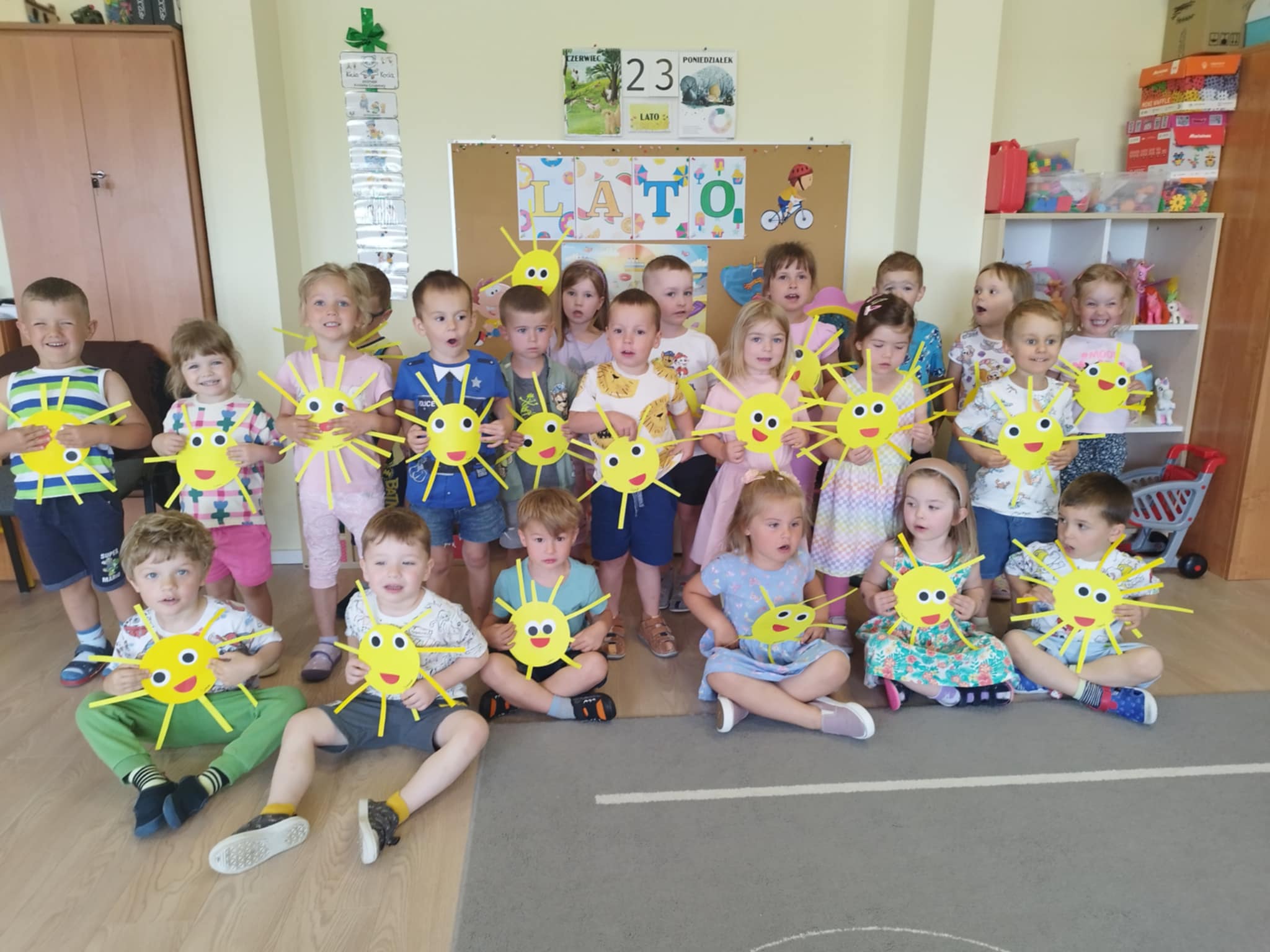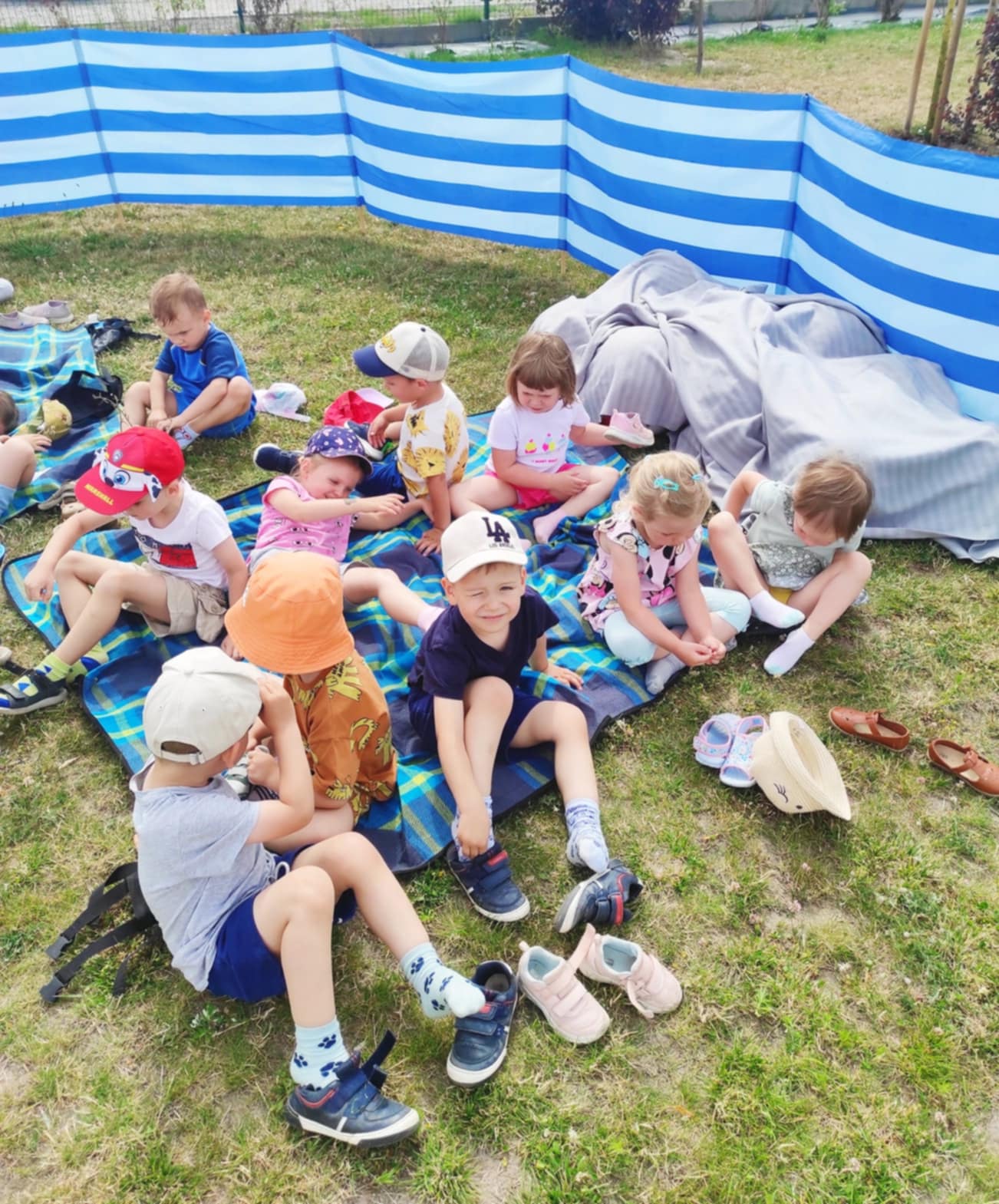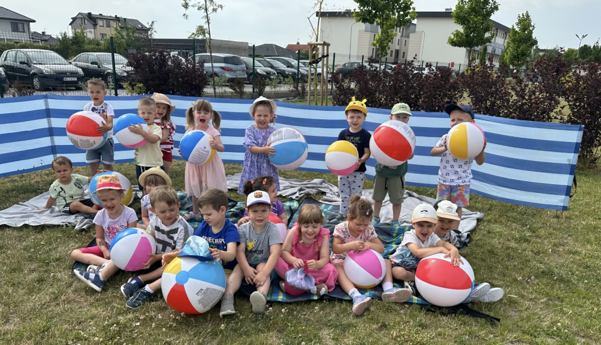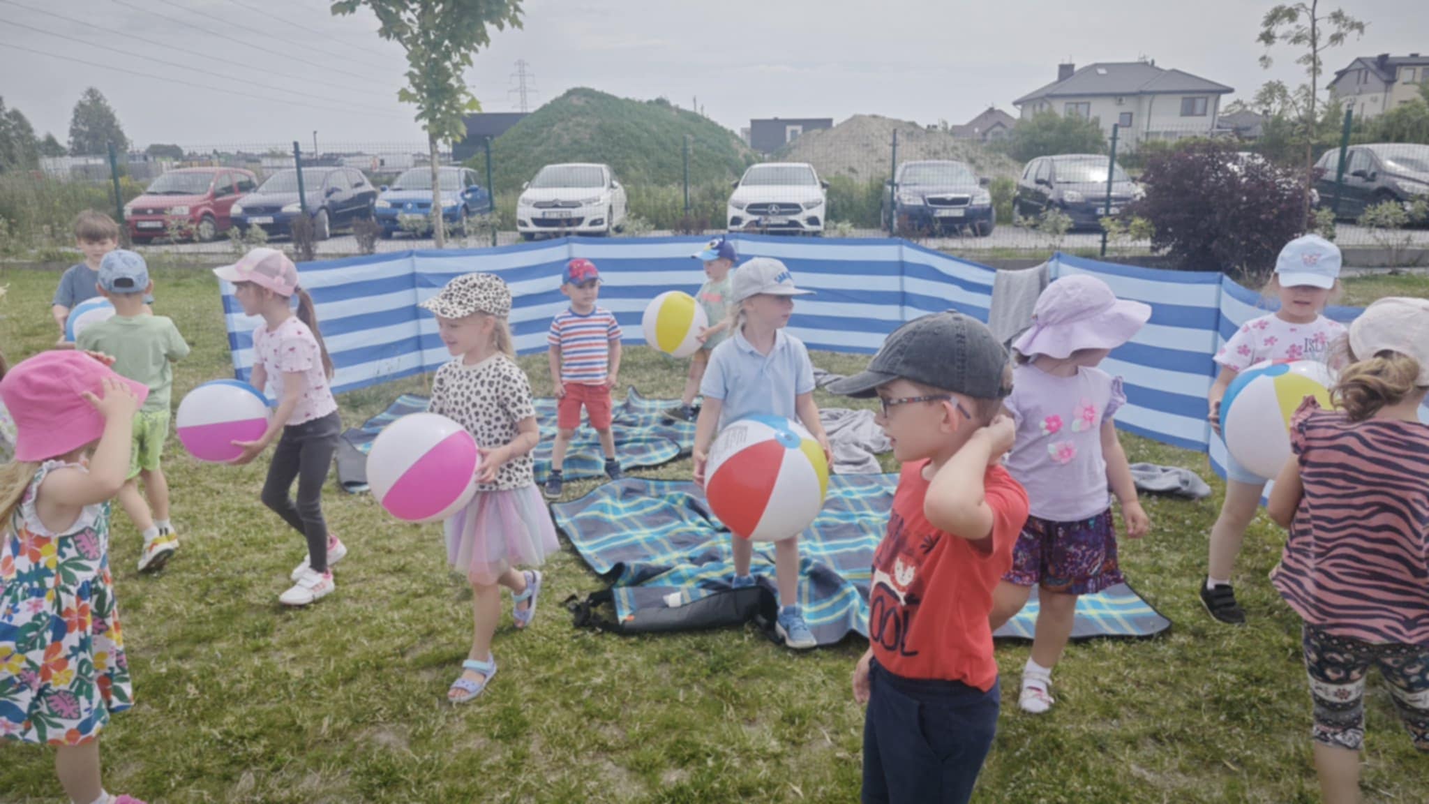 Pierwszy dzień lata w przedszkolu był pełen słońca, radości i wakacyjnej beztroski.Już od rana słoneczko zaglądało przez okna sali, zwiastując piękną pogodę. Dzieci przyszły ubrane w kolorowe, letnie ubranka i uśmiechami na twarzach. Zostały zabrane na "plażę", gdzie mogły się zrelaksować na kocyku w cieniu parawanu lub pobawić piłkami plażowymi. Tak pięknie rozpoczęło się lato w przedszkolu !