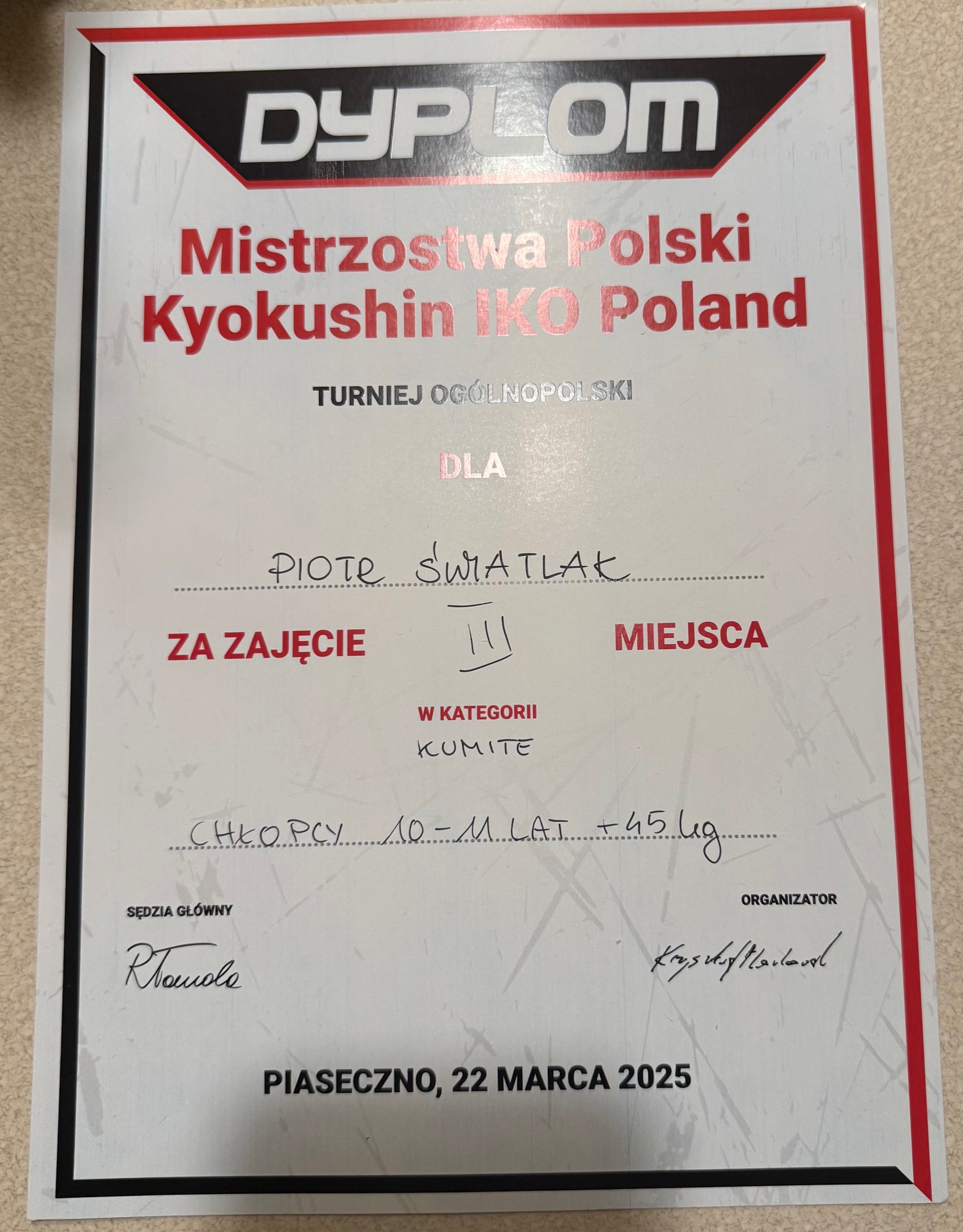 Piotr Åšwiatlak z klasy 5D w sobotÄ™ 22.03.2025 zajÄ…Å‚ 3. miejsce na Mistrzostwach Polski Kyokushin IKO Poland (kategoria 10-11 lat).