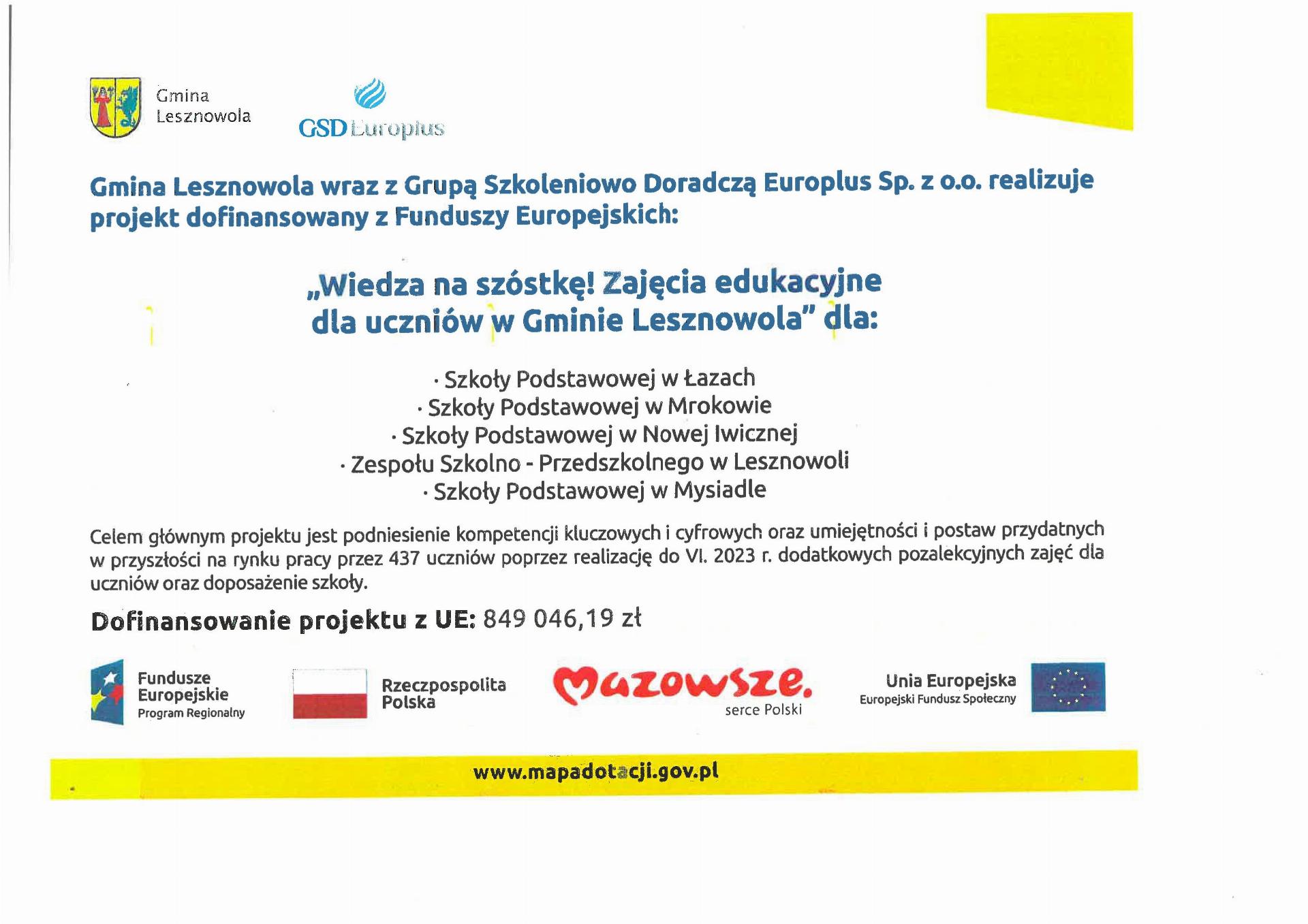 W naszej Szkole, w roku szkolnym 2021/2022 realizowany jest projekt pt. „Wiedza na szóstkę - zajęcia edukacyjne dla uczniów w Gminie Lesznowola‘’.