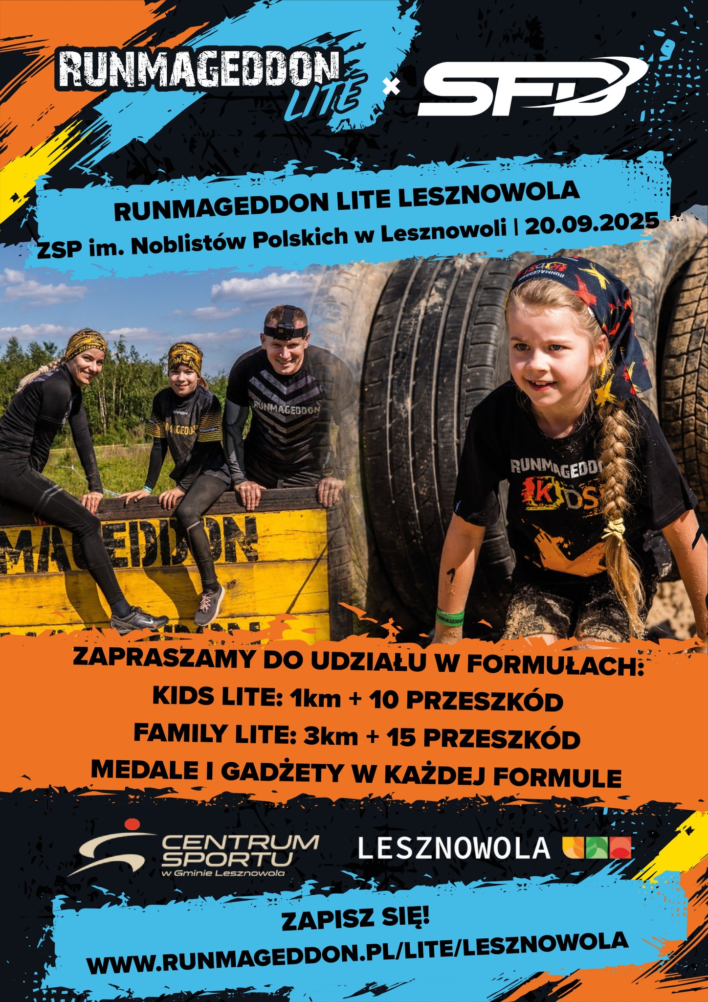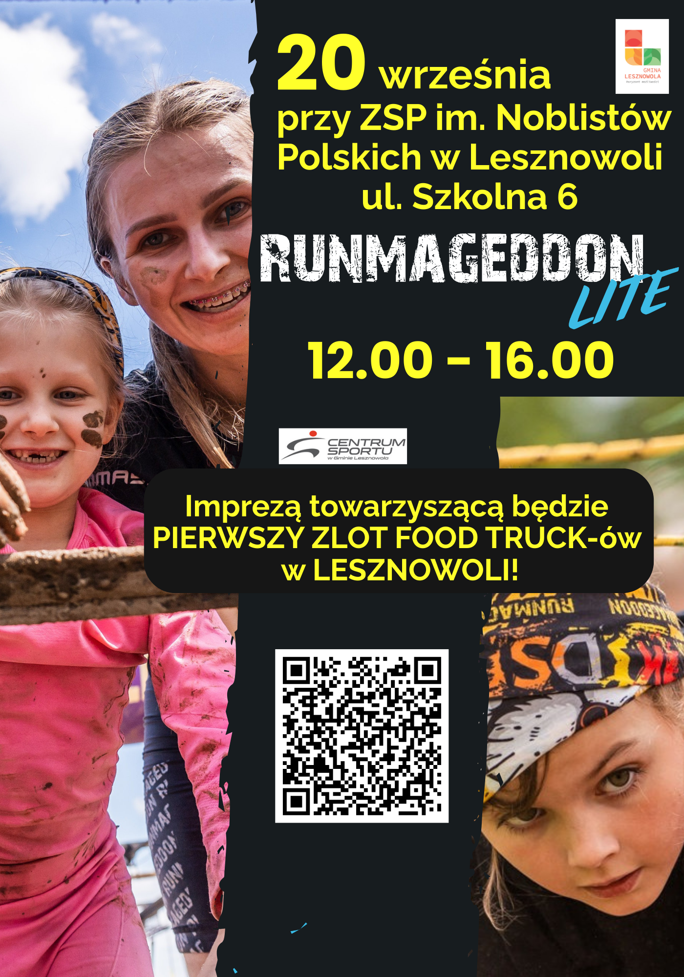 Serdecznie zapraszamy Państwa do wzięcia udziału w RUNMAGEDDON LITE. Imprezą towarzyszącą będzie Pierwszy ZLOT FOOD TRUCK-ów. Wydarzenie odbędzie się już w najbliższą sobotę tj. 20 września br. przy ZSP w Lesznowoli w godz. 12.00 – 16.00.
