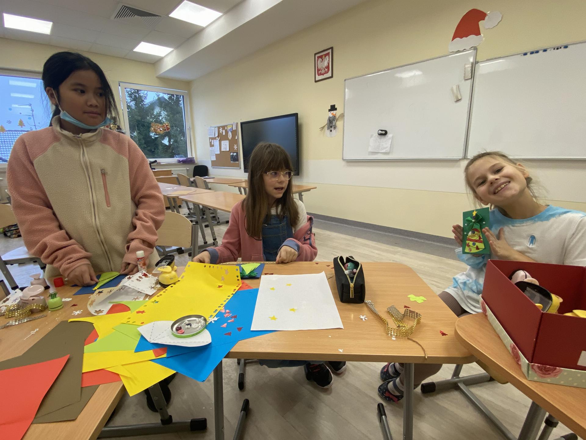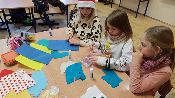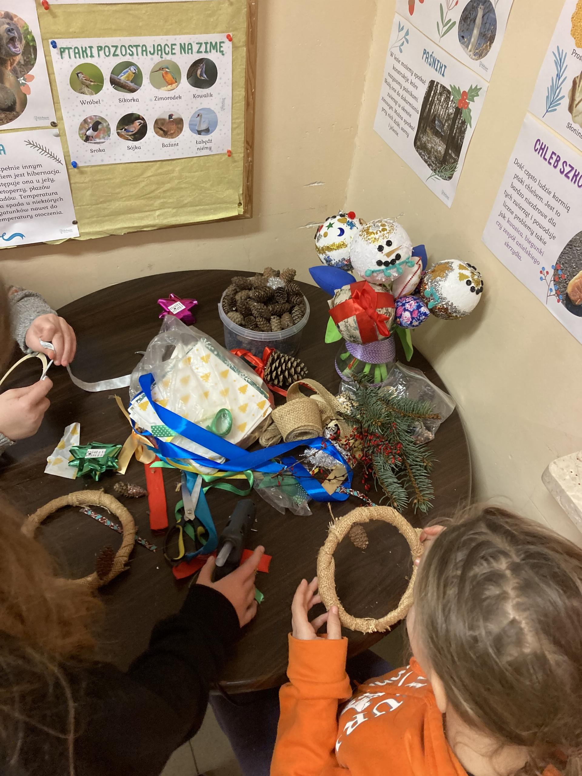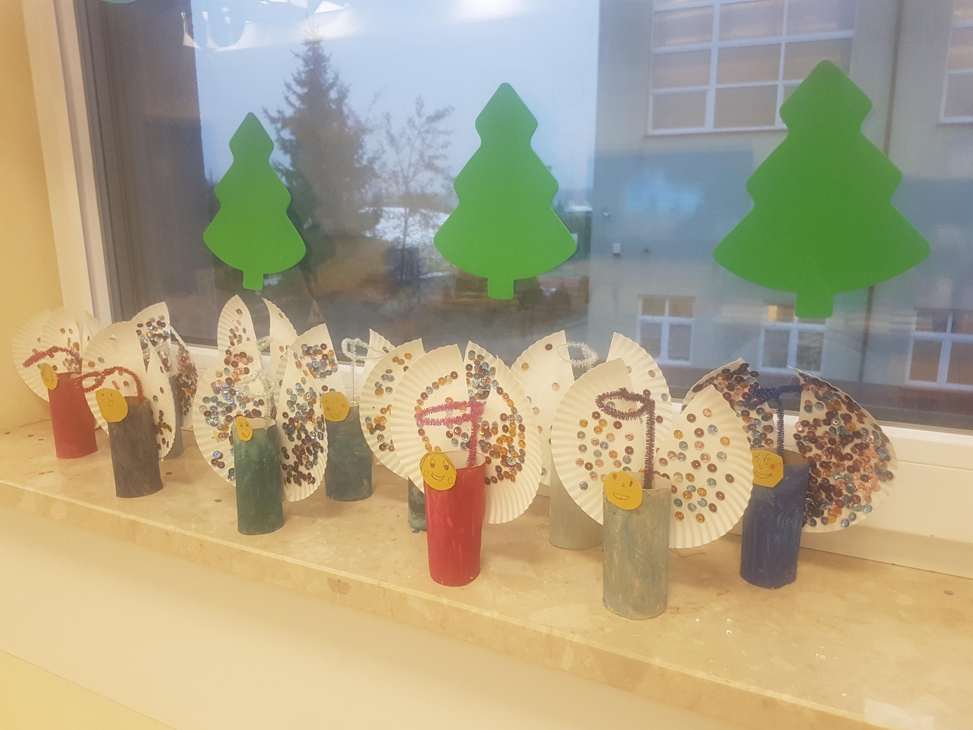 Na naszych warsztatach jak za dawnych lat tworzyliśmy piękne ptaszki z kolorowych papierów, bibułek, filcu, tasiemek, koralików i piórek. Uczniowie dekorowali choinki w salach klasowych: robili łańcuchy z bibuły, gwiazdy z papieru. Na oknach pojawiły się ręcznie wycinane gwiazdy, choinki i śnieg. Dużo radości i satysfakcji dały dzieciom warsztaty robienia papierowej choinki, włóczkowych skrzatów z czapeczkami jak również wykonywanie świątecznych kartek bożonarodzeniowych według własnych pomysłów, aniołków z masy solnej, pierniczków z masy porcelanowej, choinek makaronowych, stroików świątecznych. Piękne prace zachwycały każdego. Powstały przepiękne bombki, wianki, gwiazdki, mikołaje i inne. Niektórzy zainspirowani ludowymi pająkami ze słomy i bibuły utworzyli długi ozdobny łańcuch lub girlandę, która może być ciekawą, świąteczną dekoracją. Dzieci używały najróżniejszych materiałów. Bardzo przydatne okazały się wstążki, naklejki, cekiny, koraliki, łańcuszki i patyczki.