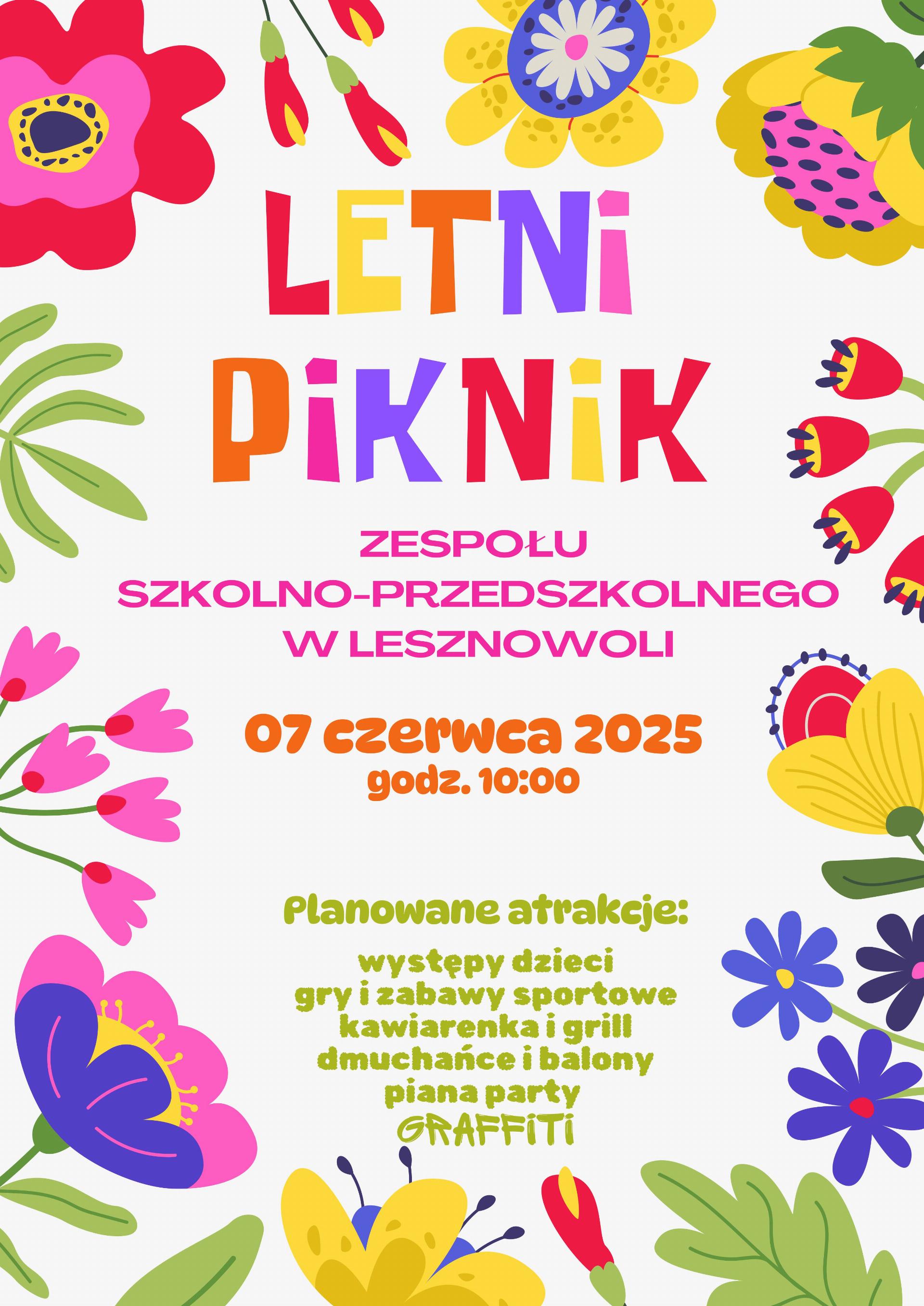 w imieniu Dyrekcji, Grona Pedagogicznego oraz Rady Rodziców serdecznie zapraszamy do udziału w Rodzinnym Pikniku Letnim w dniu 7.06.2025 w godz. 10.00-15.00.