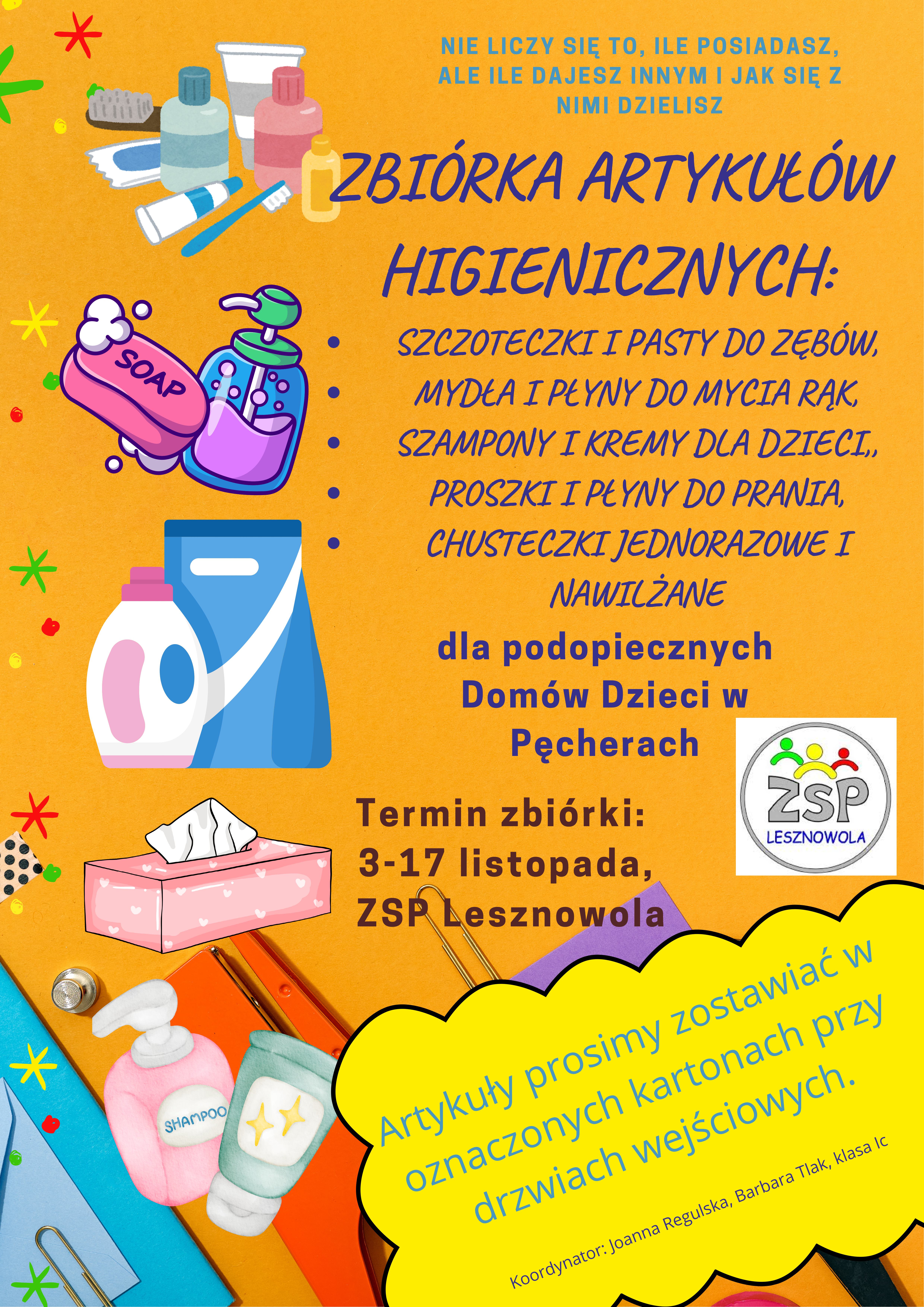 Serdecznie zapraszamy Uczniów i Rodziców Szkoły Podstawowej, Zerówek oraz Oddziałów Przedszkolnych do udziału w zbiórce artykułów higienicznych dla dzieci z Domu Dziecka w Pęcherach. Zebrane dary zostaną przekazane podopiecznym placówki opiekuńczej, aby wspomóc ich codzienną pielęgnację i higienę. Prosimy o przynoszenie takich artykułów jak: szampony, mydła, żele pod prysznic, pasty i szczoteczki do zębów, chusteczki nawilżane, płyny i proszki do prania, kremy i balsamy. Artykuły można przynosić od 3 do 17 listopada 2025r. Przy wejściach znajdą Państwo specjalnie oznaczone kartony na dary.
