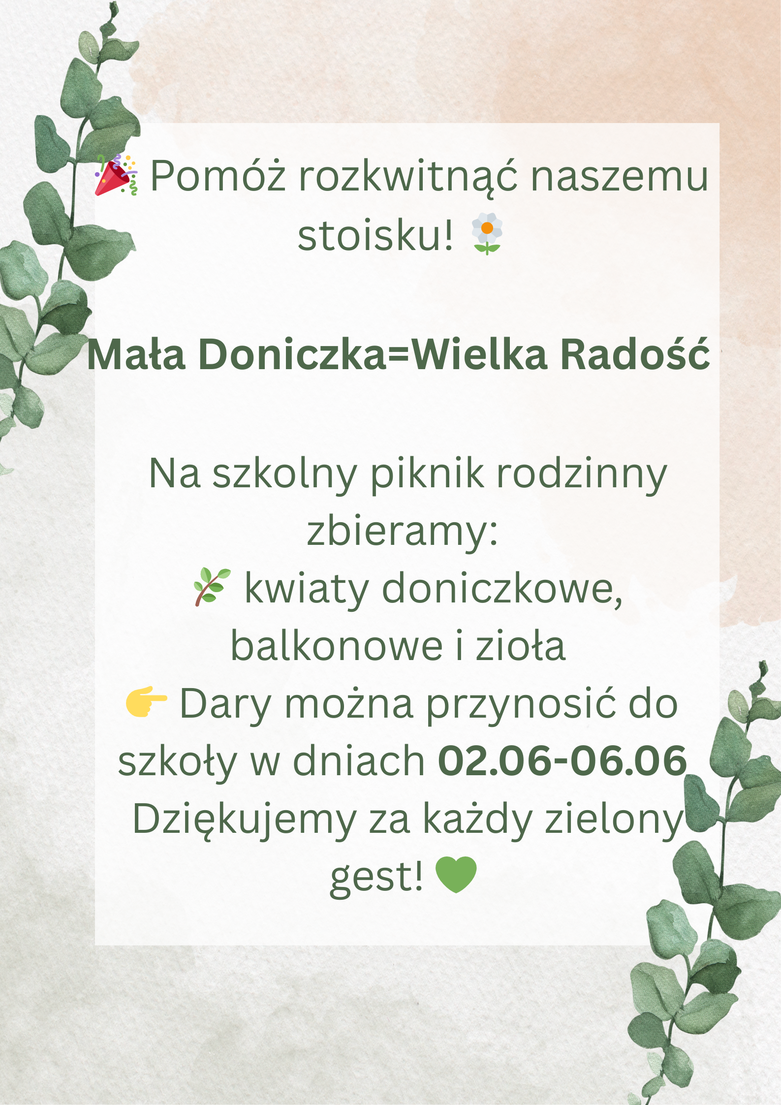 Zbliża się Szkolny Piknik Rodzinny, a jednym z naszych stoisk będzie "Mała doniczka = Wielka Radość" miejsce pełne roślin, uśmiechów i dobrej energii!